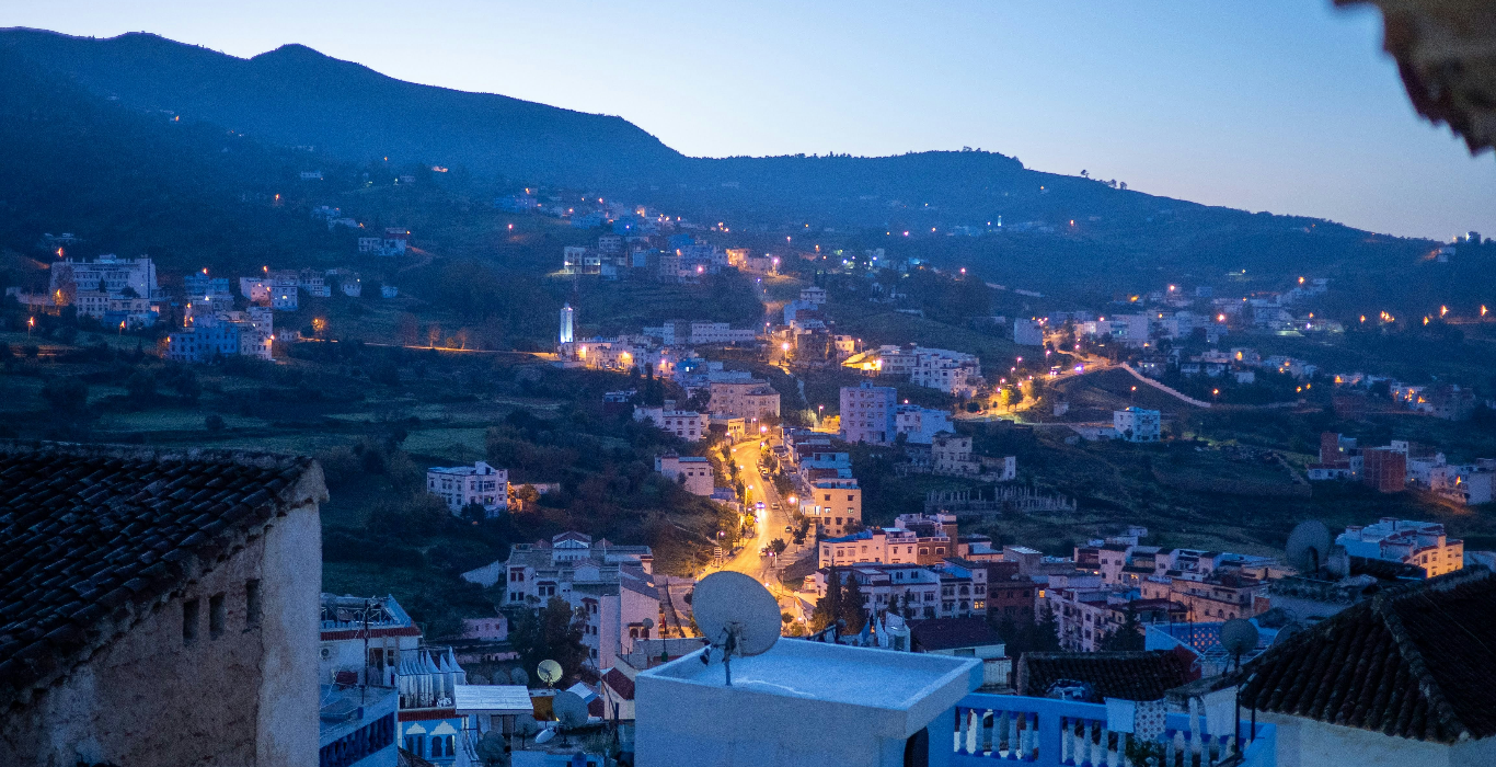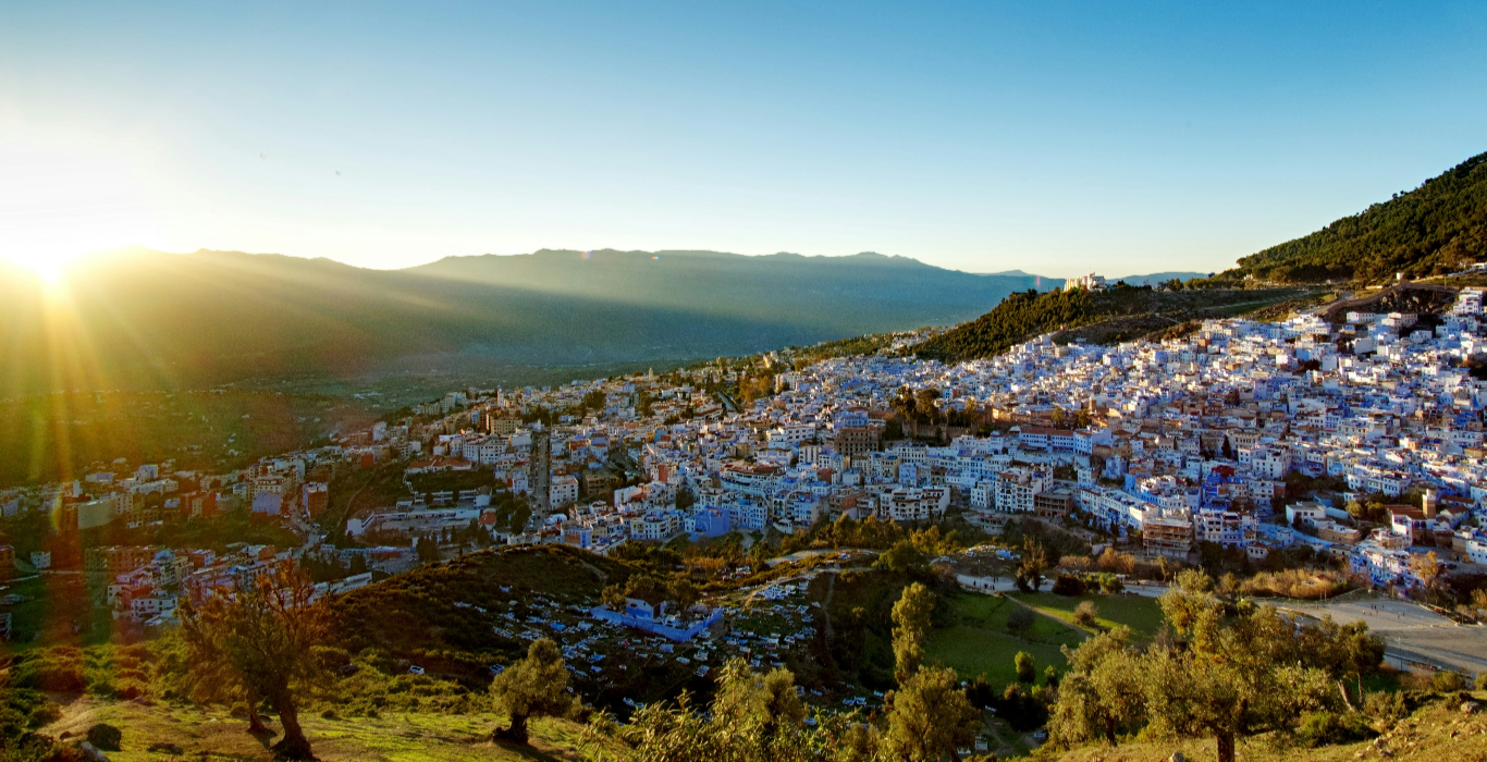 Venture on a scenic drive from Fes to Chefchaouen, a picturesque mountain town renowned for its blue-washed buildings. En route, enjoy a refreshing nature hike through the Cascades d’Akchour, where waterfalls cascade over smooth rock formations. Upon arrival, the cobalt-hued alleys of Chefchaouen unfold, inviting you to wander its charming streets and artisan shops. Visit the lively Outa el Hammam square and absorb the town’s peaceful ambiance. As the day ends, climb to the Spanish Mosque for a panoramic sunset view over the blue-splashed medina. Overnight in a cozy riad with mountain or medina views.
