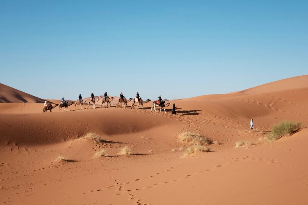 Por la tarde, disfrutarás de un paseo en camello que te llevará al corazón del desierto. Esta actividad te permite conectar de manera íntima con el entorno, siguiendo las huellas de los antiguos comerciantes que cruzaban el Sahara. La puesta de sol sobre las dunas es un espectáculo inolvidable, pintando el paisaje con cálidos tonos dorados y rojizos.